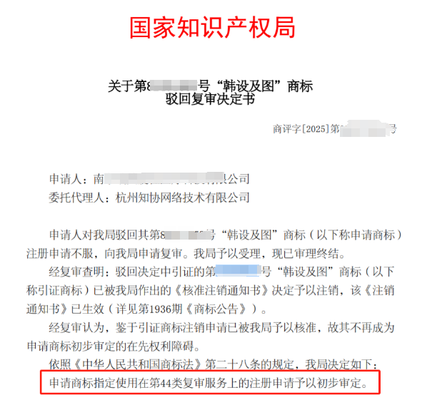 近日,我司知协代理的“韩设及图”商标驳回复审案件,收到了商标局下发的驳回复审决定书,申请商标被予以初步审定。一起来看下这个案例。