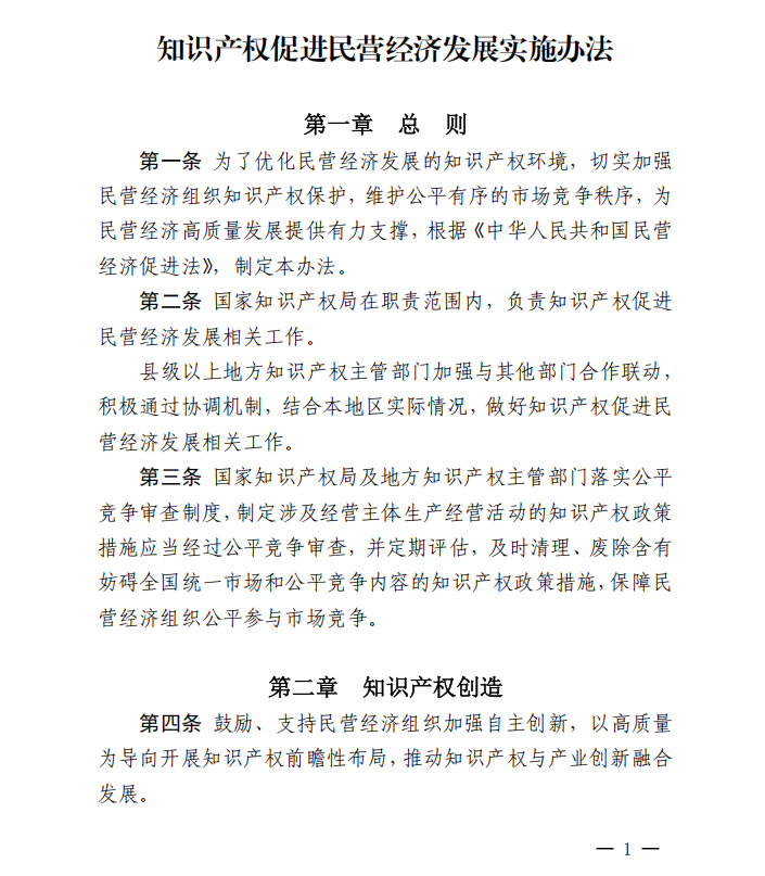 近日,国家知识产权局发布关于印发《知识产权促进民营经济发展实施办法》的通知。
