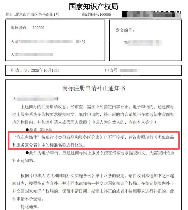 在商标注册实践中,因商品和服务项目名称不规范导致被要求补正的情况屡见不鲜。比如下面这个案例,因“汽车内饰件”按现行《类似商品和服务区分表》已不可接受,被要求补正,建议参照现行《类似商品和服务区分表》中的标准名称进行修改。
