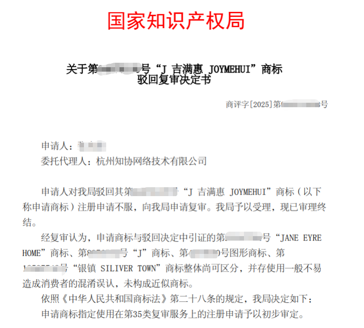 经商标局复审认为,申请商标与引证商标整体尚可区分,并存使用一般不易造成消费者的混淆误认,未构成近似商标。最终决定,申请商标指定使用在第35类复审服务上的注册申请予以初步审定。