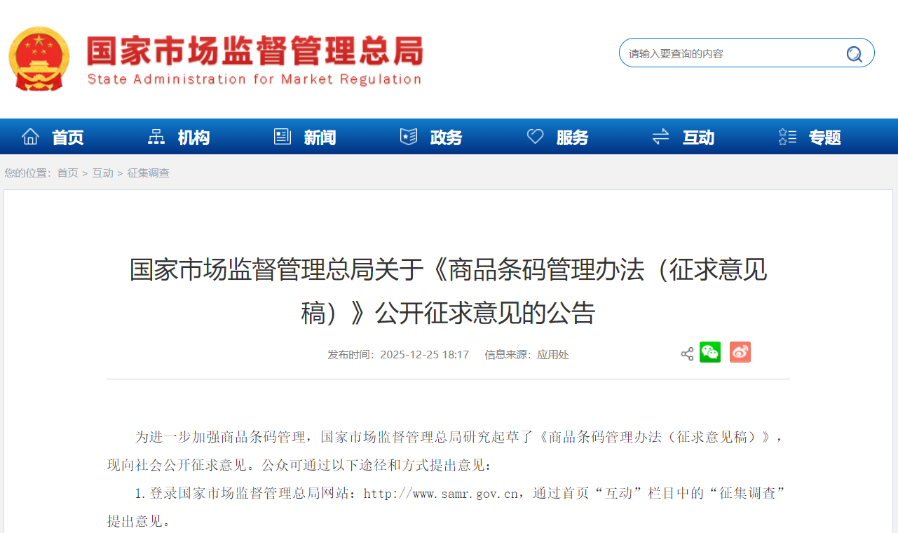 为进一步加强商品条码管理,国家市场监督管理总局研究起草了《商品条码管理办法(征求意见稿)》,现向社会公开征求意见。