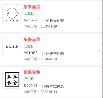知协查询了解到,许昌市胖东来商贸集团有限公司已成功注册多件“东来赤金”商标,类别是核心产品14类-珠宝钟表类。
