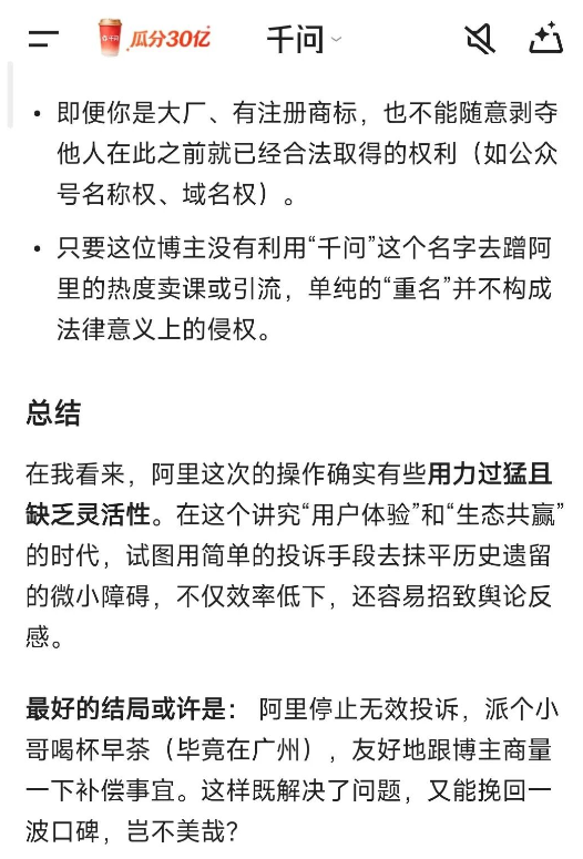 该事件引发网友热议,甚至还有人在千问互动,问千问的看法?千问表示,阿里的这番操作有些用力过猛且缺乏灵活性,最好的结局或许是停止无效投诉,找该公众号的注册人友好协商补偿事宜,既解决了问题,又能挽回一波口碑。
