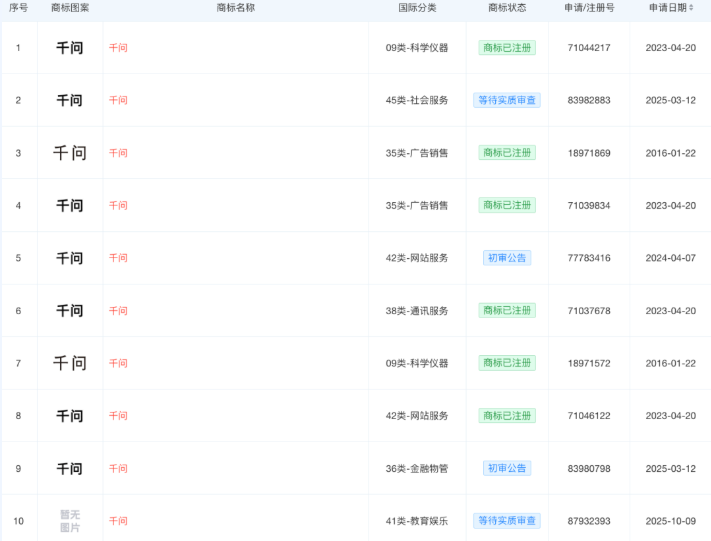 知协查询了解到,阿里最早于2016年开始为千问申请商标注册,已成功注册多枚“千问”商标,覆盖第9类科学仪器、第35类广告销售、第38类通讯服务、第42类设计研究等多个国际分类。同时,阿里还注册了英文商标“Tongyi Qwen”,进一步强化品牌保护。