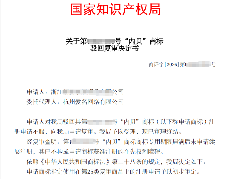 经商标局复审查明,引证商标不构成申请商标获准注册的在先权利障碍,被予以初步审定。