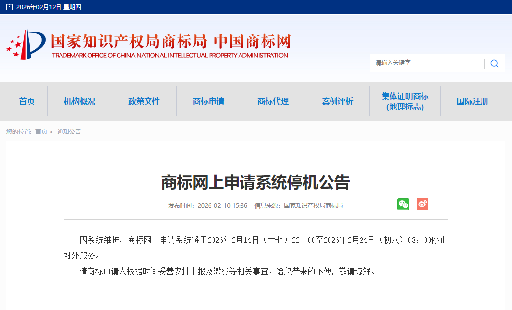 如您近期有商标注册申请、驳回复审、异议答辩、续展、变更、转让等计划,建议尽量在2月14日22:00前提交完成,并同步完成缴费,避免因系统关闭导致错过申请日或法定期限。