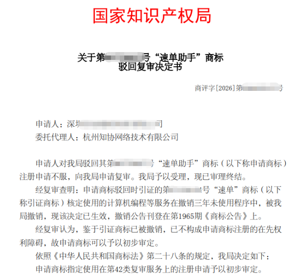 商标注册路上,遭遇驳回是常有的事,但驳回不等于最终结局。近日,知协再次成功代理一起商标驳回复审案件——在申请商标“速单助手”因引证商标“速单”被驳回的情况下,我们通过撤三+复审的组合策略,成功扫清在先权利障碍,最终助力商标驳回复审成功。