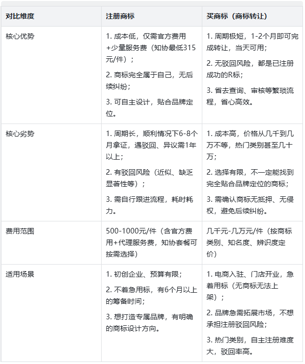 先给大家一个直白结论:急着用标、追求稳妥,选买商标;预算有限、不着急用,选注册商标。为了让大家一目了然,我们整理了清晰的对比表,涵盖大家最关心的所有要点,建议收藏备用。