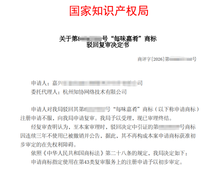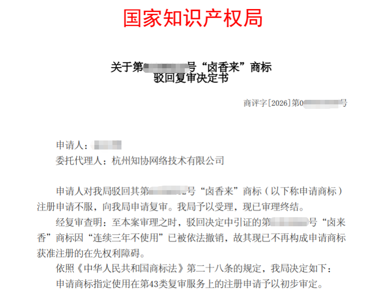 申请人提交申请的“卤香来”商标撞上他人在先注册的“卤来香”商标,在知协的代理下,引证商标“卤来香”因“连续三年不使用”已被依法撤销,故其现已不再构成申请商标获准注册的在先权利障碍。最终,申请商标指定使用在第43类复审服务上的注册申请予以初步审定。