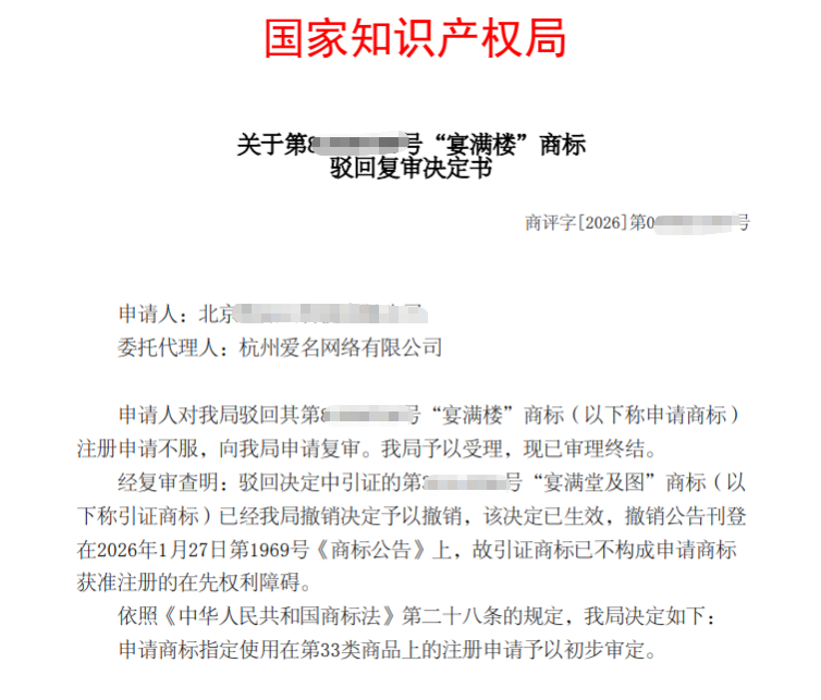 “宴满楼”商标(申请商标)遇上“宴满堂及图”商标(引证商标)被驳回,复审时,引证商标被予以撤销,不构成申请商标获准注册的在先权利障碍。最终,申请商标指定使用在第33类商品上的注册申请予以初步审定。