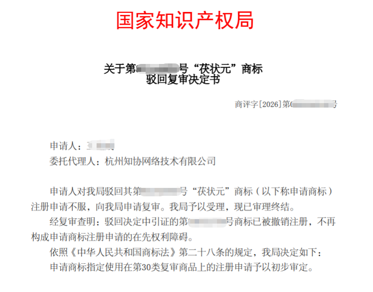 申请人提交“茯状元”商标(以下称申请商标),经审查已有人提前注册,因此被驳回。为了帮助申请商标获准注册,我们对在先注册商标提出撤销申请。复审时,撤销决定已生效,不再构成申请商标注册申请的在先权利障碍。最终,申请商标指定使用在第30类复审商品上的注册申请予以初步审定。