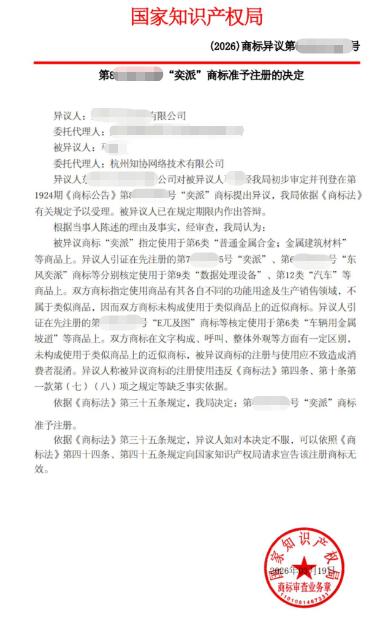 最终,商标局决定“奕派”商标准予注册。