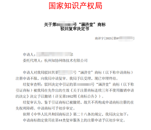知协商标成功案例丨“涵济堂”商标驳回复审成功